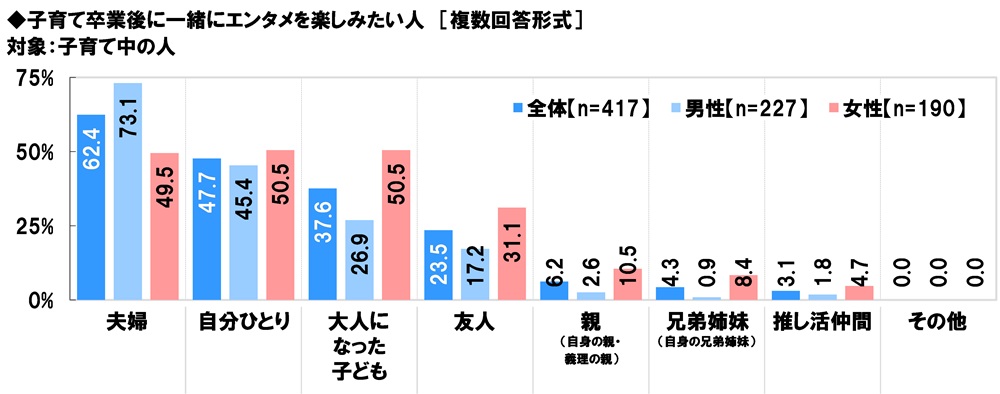 子育て中の人(417名)に、子育て卒業後に一緒にエンタメを楽しみたい人を聞いたところ、「夫婦」(62.4%)が最も高くなり、「自分ひとり」(47.7%)、「大人になった子ども」(37.6%)、「友人」(23.5%)、「親(自身の親・義理の親)」(6.2%)が続きました。