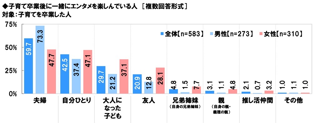 子育てを卒業した人(583名)に、子育て卒業後に一緒にエンタメを楽しんでいる人を聞いたところ、「夫婦」(59.7%)が最も高くなり、「自分ひとり」(42.5%)、「大人になった子ども」(29.7%)、「友人」(20.9%)、「兄弟姉妹(自身の兄弟姉妹)」(4.8%)が続きました。