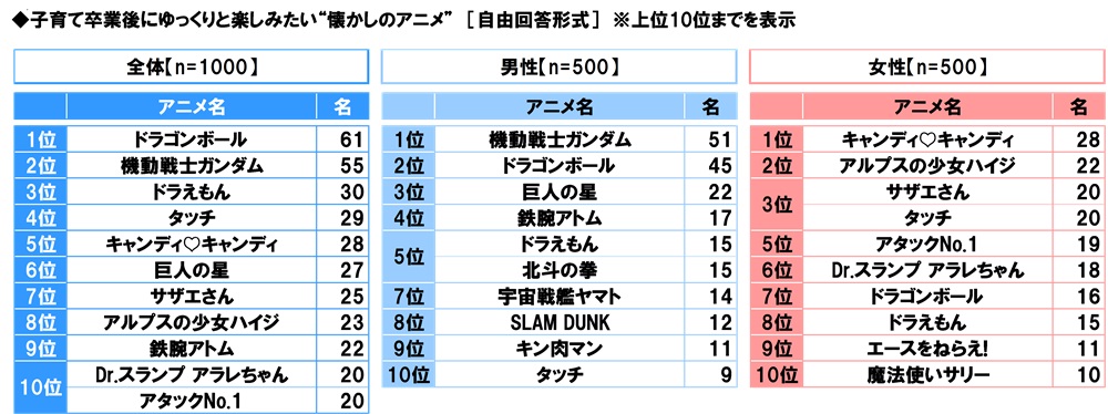 男女別にみると、男性では1位「機動戦士ガンダム」(51名)、2位「ドラゴンボール」(45名)、3位「巨人の星」(22名)、女性では1位「キャンディ♡キャンディ」(28名)、2位「アルプスの少女ハイジ」(22名)、3位「サザエさん」「タッチ」(いずれも20名)となりました。