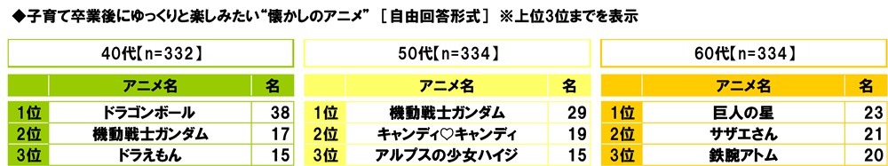 全回答者(1,000名)に、子育て卒業後にゆっくりと楽しみたい“懐かしのアニメ”を聞いたところ、1位「ドラゴンボール」(61名)、2位「機動戦士ガンダム」(55名)、3位「ドラえもん」(30名)となりました。