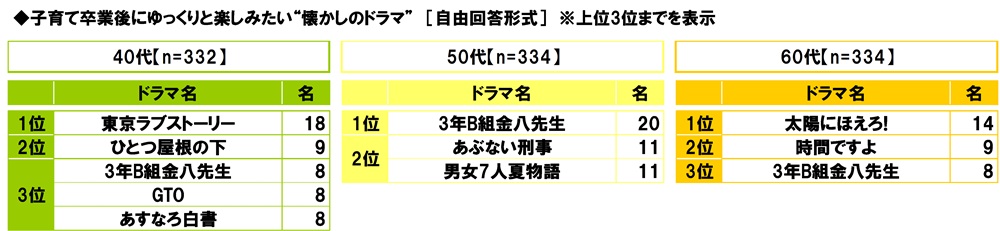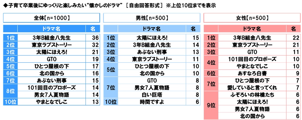 全回答者(1,000名)に、子育て卒業後にゆっくりと楽しみたい“懐かしのドラマ”を聞いたところ、1位「3年B組金八先生」(36名)、2位「東京ラブストーリー」(32名)、3位「太陽にほえろ!」(21名)となりました。