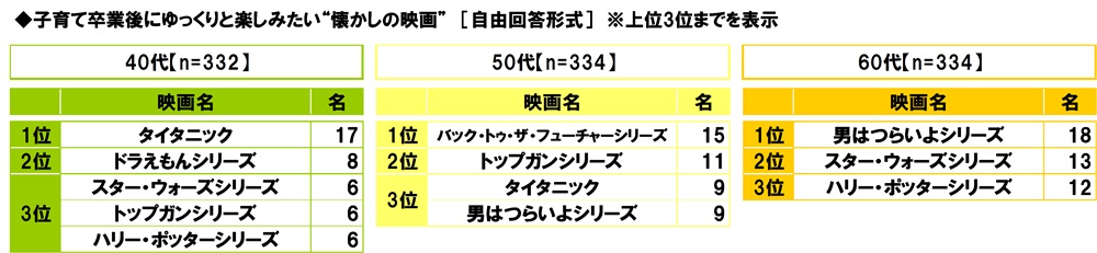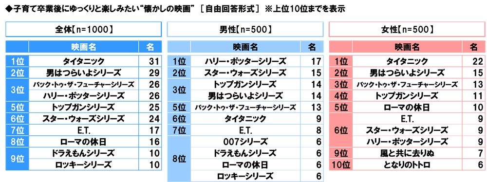 全回答者(1,000名)に、子育て卒業後にゆっくりと楽しみたい“懐かしの映画”を聞いたところ、1位「タイタニック」(31名)、2位「男はつらいよシリーズ」(29名)、3位「バック・トゥ・ザ・フューチャーシリーズ」「ハリー・ポッターシリーズ」(いずれも26名)となりました。