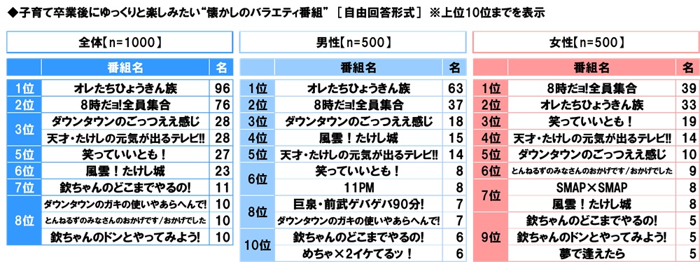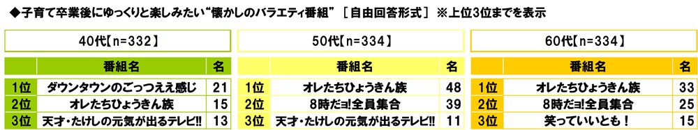 全回答者(1,000名)に、子育て卒業後にゆっくりと楽しみたい“懐かしのバラエティ番組”を聞いたところ、1位「オレたちひょうきん族」(96名)、2位「8時だョ!全員集合」(76名)、3位「ダウンタウンのごっつええ感じ」「天才・たけしの元気が出るテレビ!!」(いずれも28名)となりました。