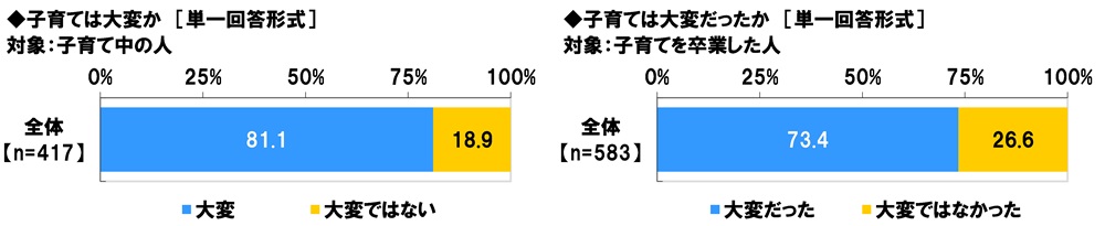 また、子育てを卒業した人(583名)に、子育ては大変だったか聞いたところ、「大変だった」は73.4%、「大変ではなかった」は26.6%でした。