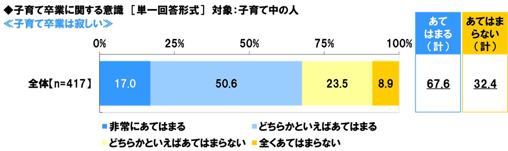 ≪子育て卒業は寂しい≫について、子育て中の人(417名)の回答をみると、「非常にあてはまる」は17.0%、「どちらかといえばあてはまる」は50.6%で、合計した『あてはまる(計)』は67.6%、「全くあてはまらない」は8.9%、「どちらかといえばあてはまらない」は23.5%で、合計した『あてはまらない(計)』は32.4%となりました。子育て中の人の約3人に2人が、子どもが大人になり親の手を離れていくことに寂しさを感じるようです。