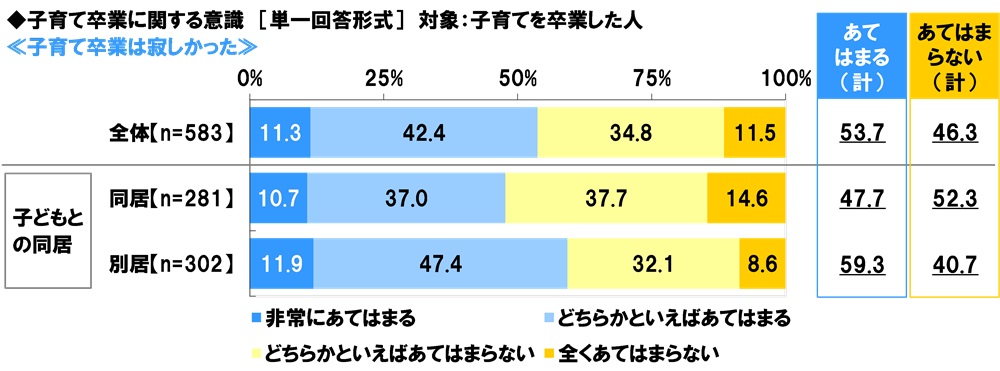 ≪子育て卒業は寂しかった≫について、子育てを卒業した人(583名)の回答をみると、『あてはまる(計)』は53.7%、『あてはまらない(計)』は46.3%となりました。既に子育てを終えた人では、子育て卒業に寂しさを感じた人は約半数でした。