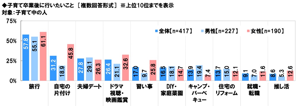 子育て中の人(417名)に、子育て卒業後に行いたいことを聞いたところ、「旅行」(57.8%)が最も高くなりました。子どもの世話を気にせずに、大人の旅行を楽しみたいと思う人が多いのではないでしょうか。次いで高くなったのは、「自宅の片付け」(31.2%)、「夫婦デート」(27.8%)、「ドラマ視聴・映画鑑賞」(26.4%)、「習い事」(17.0%)でした。