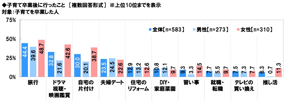 子育てを卒業した人(583名)に、子育て卒業後に行ったことを聞いたところ、「旅行」(44.4%)が最も高くなり、「ドラマ視聴・映画鑑賞」(32.8%)、「自宅の片付け」(30.0%)、「夫婦デート」(23.5%)、「住宅のリフォーム」(12.9%)が続きました。
