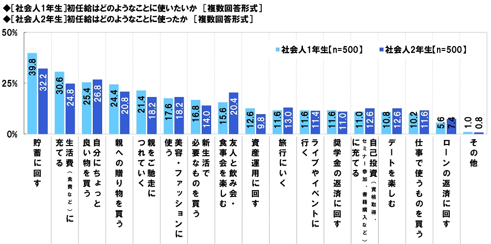 次に、社会人2年生(500名)に、初任給はどのようなことに使ったか聞いたところ、「貯蓄に回す」(32.2%)が最も高くなり、「自分にちょっと良い物を買う」(26.8%)、「生活費(食費など)に充てる」(24.8%)、「親への贈り物を買う」(20.8%)、「友人と飲み会・食事会を楽しむ」(20.4%)が続きました。