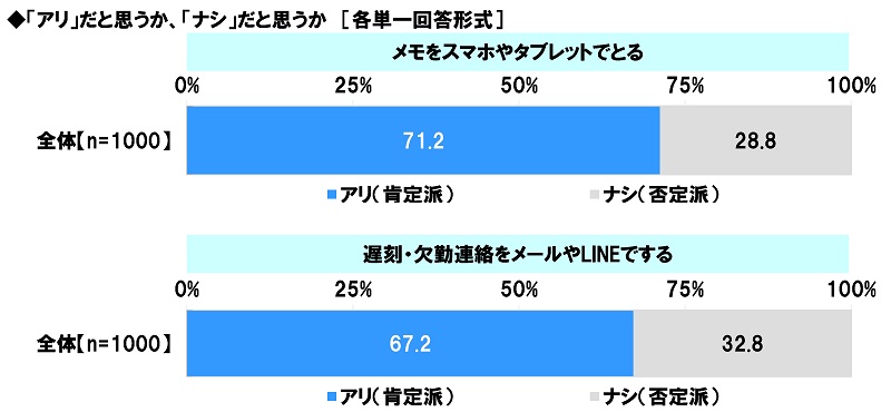 ≪メモをスマホやタブレットでとる≫では「アリ」は71.2%、「ナシ」は28.8%、≪遅刻・欠勤連絡をメールやLINEでする≫では「アリ」は67.2%、「ナシ」は32.8%となりました。