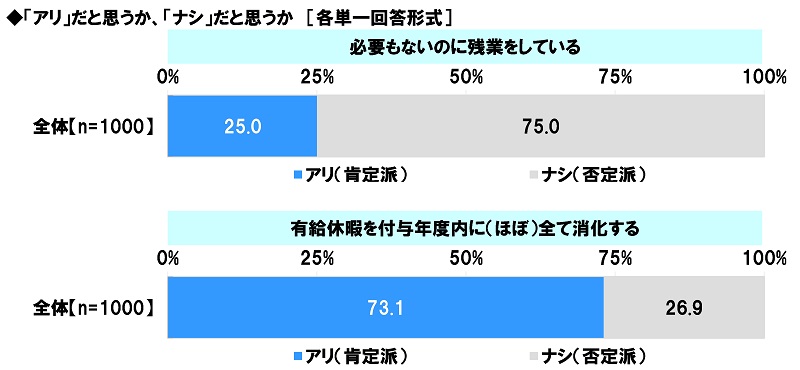 また、≪有給休暇を付与年度内に(ほぼ)全て消化する≫では、「アリ」は73.1%、「ナシ」は26.9%となりました。有給休暇を全て消化することを肯定的に捉える人が多いようです。