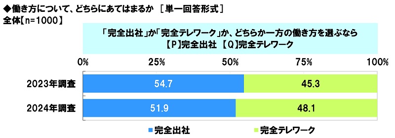 昨年の調査結果と比較すると、「完全出社」と回答した人の割合は、2023年54.7%→2024年51.9%と2.8ポイント下降しました。