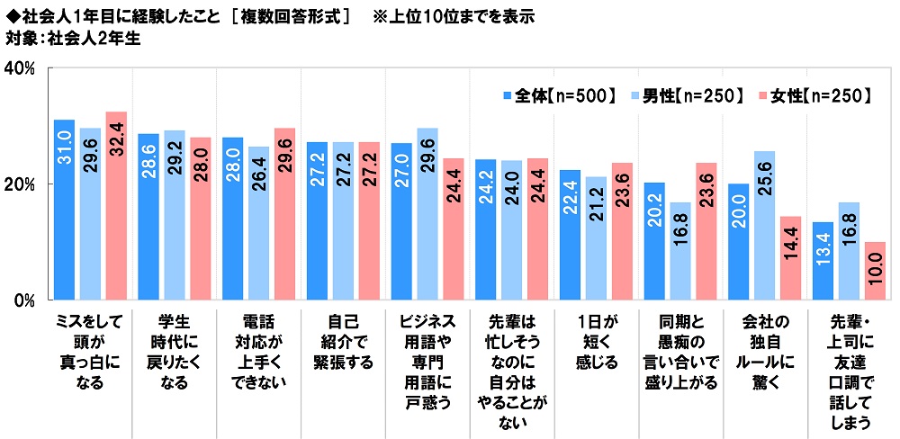 社会人2年生(500名)に、社会人1年目に経験したことを聞いたところ、「ミスをして頭が真っ白になる」(31.0%)が最も高くなりました。不慣れな仕事で失敗し、気が動転してしまった人が多いのではないでしょうか。次いで高くなったのは、「学生時代に戻りたくなる」(28.6%)、「電話対応が上手くできない」(28.0%)、「自己紹介で緊張する」(27.2%)、「ビジネス用語や専門用語に戸惑う」(27.0%)でした。