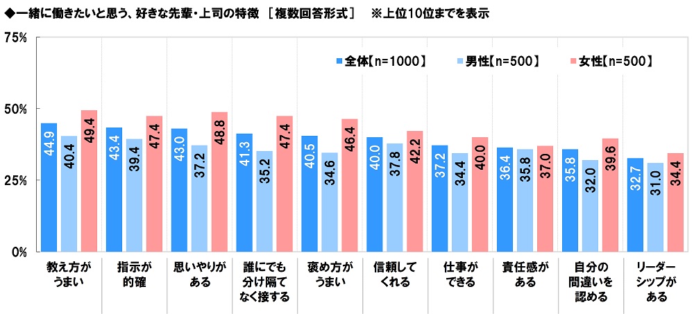 男女別にみると、「思いやりがある」(男性37.2%、女性48.8%)、「誰にでも分け隔てなく接する」(男性35.2%、女性47.4%)、「褒め方がうまい」(男性34.6%、女性46.4%)は、男性と比べて女性のほうが10ポイント以上高くなりました。