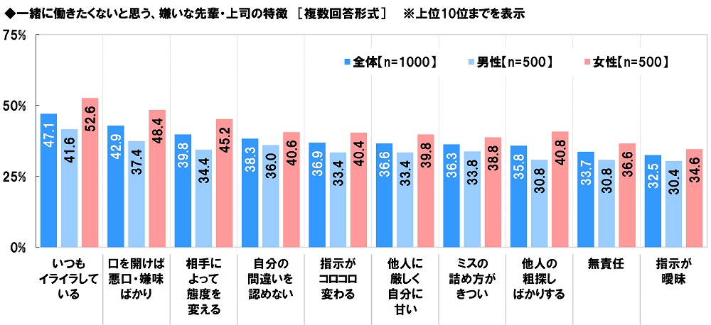 全回答者(1,000名)に、一緒に働きたくないと思う、嫌いな先輩・上司の特徴を聞いたところ、「いつもイライラしている」(47.1%)が最も高くなりました。常に不機嫌そうな先輩・上司には好感を持てないという社会人1年生・2年生が多いようです。次いで高くなったのは、「口を開けば悪口・嫌味ばかり」(42.9%)、「相手によって態度を変える」(39.8%)、「自分の間違いを認めない」(38.3%)、「指示がコロコロ変わる」(36.9%)でした。