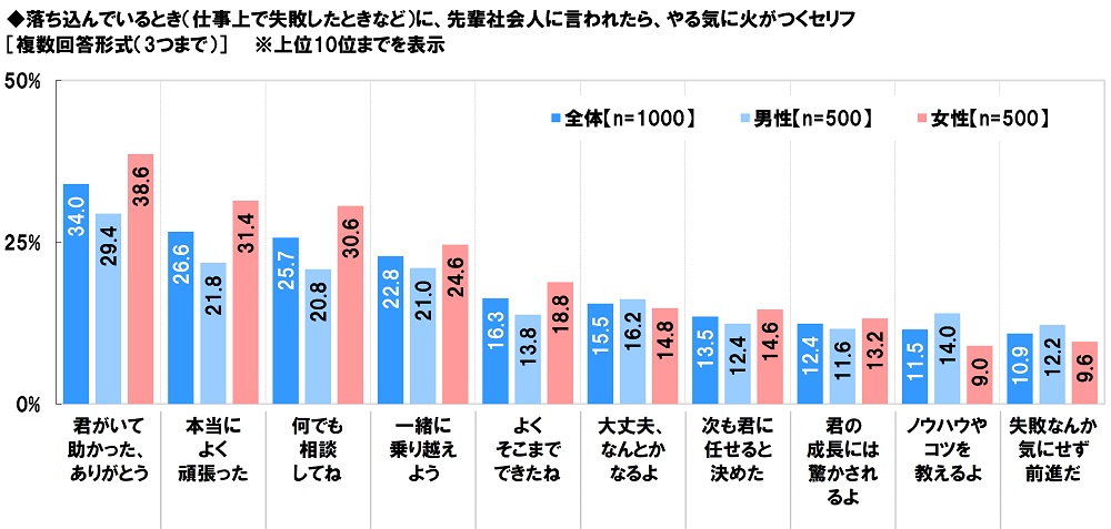 全回答者(1,000名)に、落ち込んでいるとき(仕事上で失敗したときなど)に、先輩社会人に言われたら、やる気に火がつくセリフを聞いたところ、「君がいて助かった、ありがとう」(34.0%)が最も高くなりました。感謝の気持ちを言葉で伝えられると、モチベーションがアップするという人が多いようです。次いで高くなったのは、「本当によく頑張った」(26.6%)、「何でも相談してね」(25.7%)、「一緒に乗り越えよう」(22.8%)、「よくそこまでできたね」(16.3%)でした。
