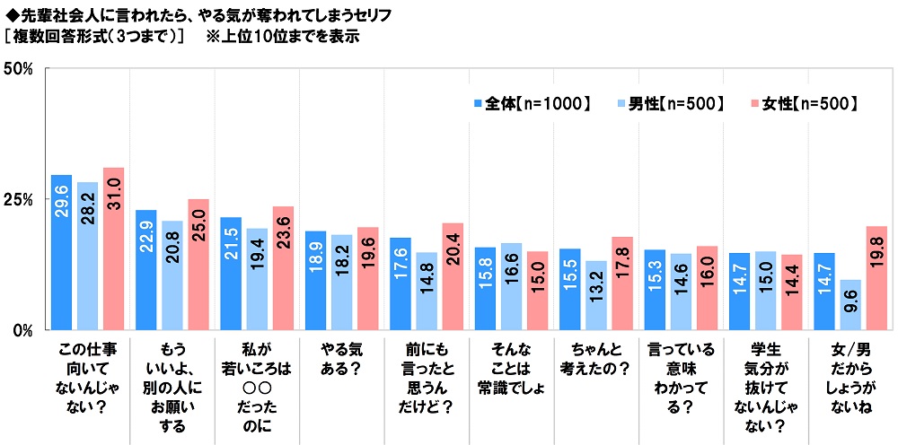 全回答者(1,000名)に、先輩社会人に言われたら、やる気が奪われてしまうセリフを聞いたところ、「この仕事向いてないんじゃない?」(29.6%)が最も高くなりました。適性を否定するような言葉を投げかけられると、努力する意味や目的を見失ってしまう人が多いのではないでしょうか。次いで高くなったのは、「もういいよ、別の人にお願いする」(22.9%)、「私が若いころは○○だったのに」(21.5%)、「やる気ある?」(18.9%)、「前にも言ったと思うんだけど?」(17.6%)でした。
