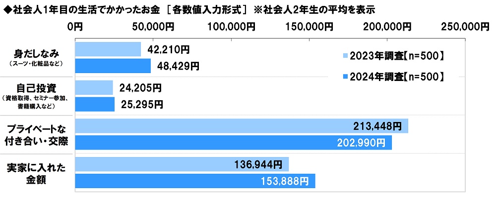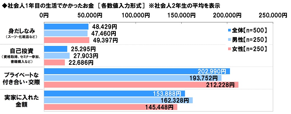かかった金額の平均をみると、≪身だしなみ(スーツ・化粧品など)≫では48,429円、≪自己投資(資格取得、セミナー参加、書籍購入など)≫では25,295円、≪プライベートな付き合い・交際≫では202,990円、≪実家に入れた金額≫では153,888円となりました。