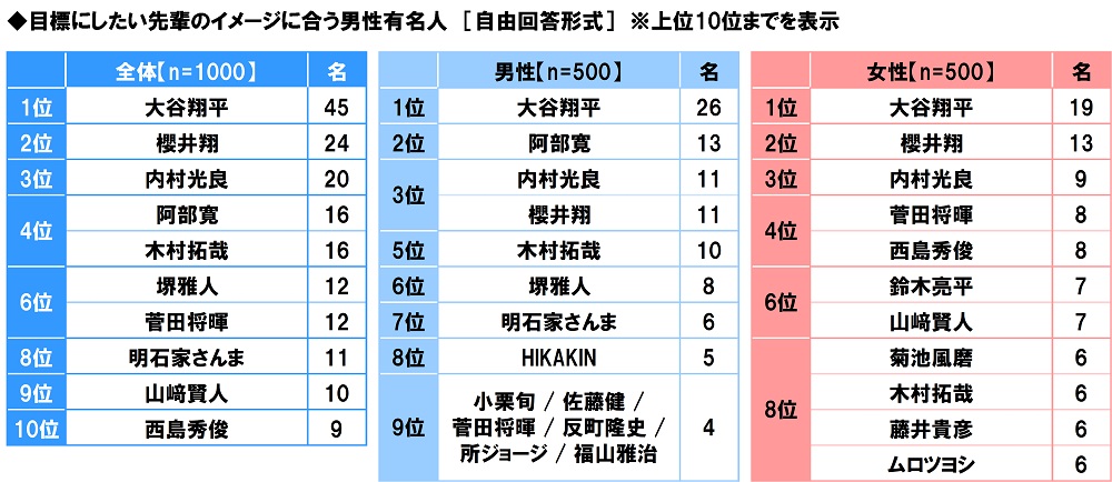 目標にしたい先輩のイメージに合う男性有名人 1位「大谷翔平さん」2位「櫻井翔さん」