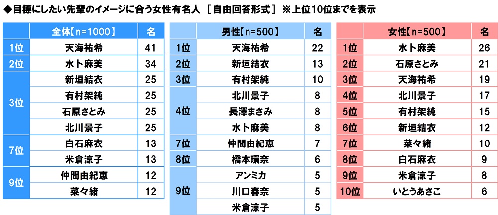 目標にしたい先輩のイメージに合う女性有名人 1位「天海祐希さん」2位「水卜麻美さん」