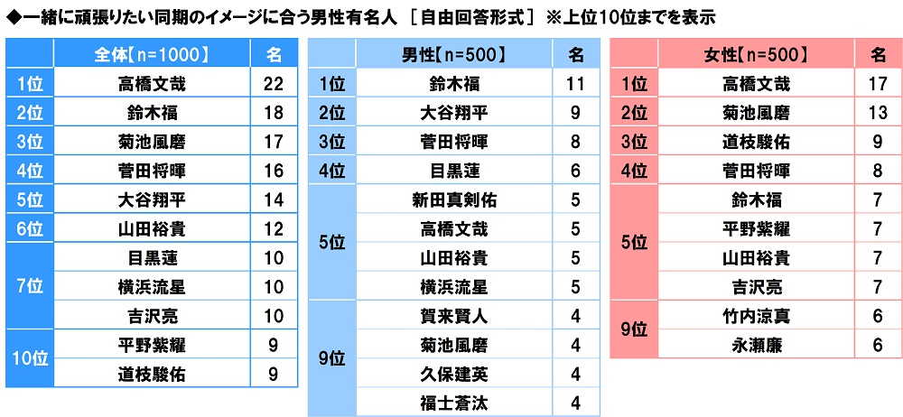 一緒に頑張りたい同期のイメージに合う有名人を聞いたところ、男性有名人では1位「高橋文哉さん」、2位「鈴木福さん」、3位「菊池風磨さん」となりました。