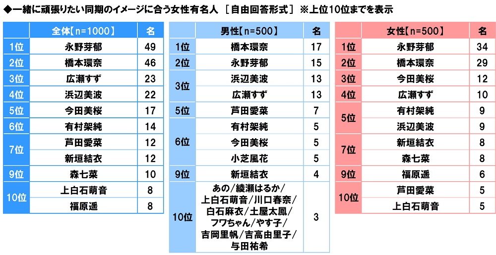 一緒に頑張りたい同期のイメージに合う女性有名人TOP3 「永野芽郁さん」「橋本環奈さん」「広瀬すずさん」
