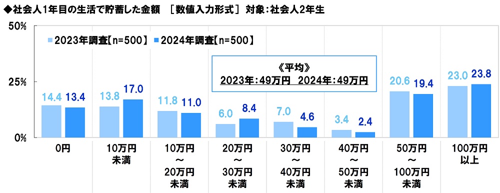 社会人1年目の生活で貯蓄した金額を聞いたところ、「10万円未満」(17.0%)や「50万円~100万円未満」(19.4%)、「100万円以上」(23.8%)に回答が分かれ、平均は49万円となり昨年の調査結果と同じ金額でした。