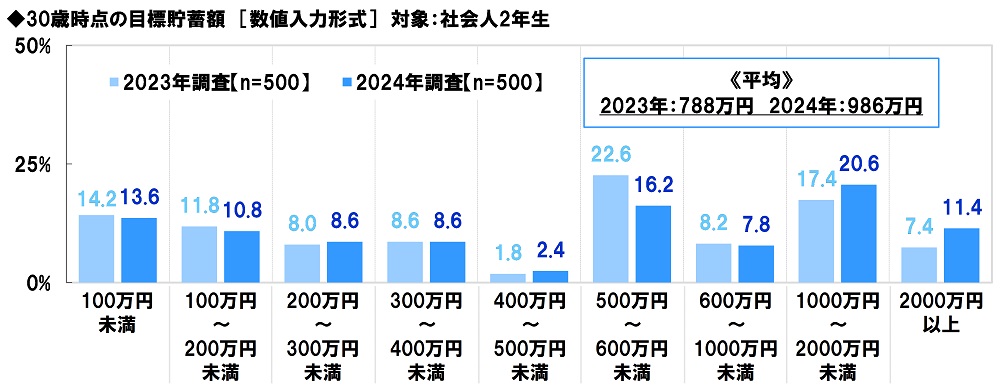 社会人2年生の30歳時点の目標貯蓄額 平均986万円、昨年調査から198万円増加