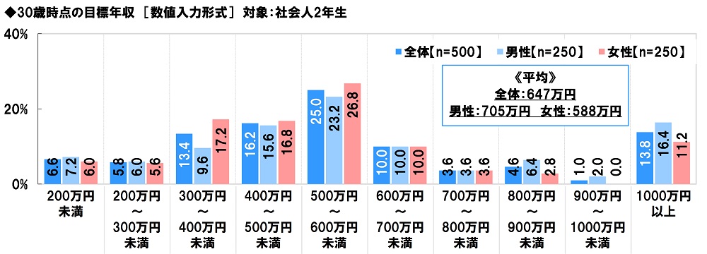社会人2年生(500名)に、30歳時点の目標年収を聞いたところ、「500万円~600万円未満」(25.0%)に多くの回答が集まったほか、「300万円~400万円未満」(13.4%)や「400万円~500万円未満」(16.2%)、「1000万円以上」(13.8%)にも回答が集まり、平均は647万円となりました。