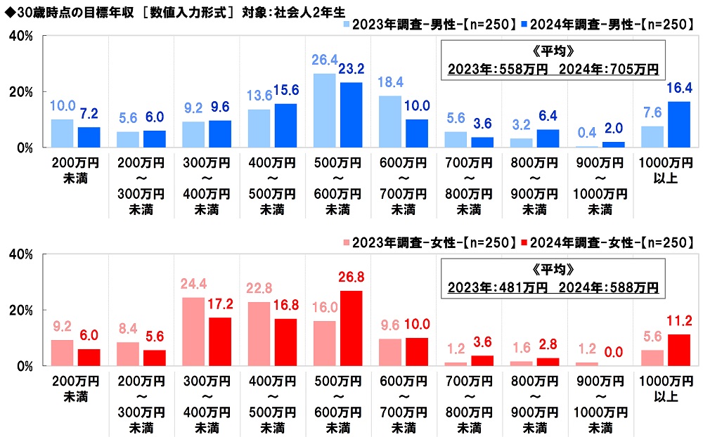 昨年の調査結果と比較すると、男性では2023年558万円→2024年705万円と147万円増加し、女性では2023年481万円→2024年588万円と107万円増加しました。