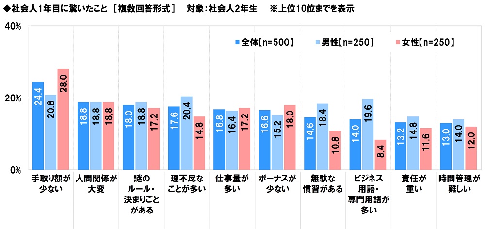社会人2年生(500名)に、社会人1年目に驚いたことを聞いたところ、「手取り額が少ない」(24.4%)が最も高くなりました。給与の額面に対し、実際に手元に入る額が思いのほか少ないと感じた人が多いのではないでしょうか。次いで高くなったのは、「人間関係が大変」(18.8%)、「謎のルール・決まりごとがある」(18.0%)、「理不尽なことが多い」(17.6%)、「仕事量が多い」(16.8%)でした。職場の人間関係の難しさや独特のルールにびっくりした人は少なくないようです。