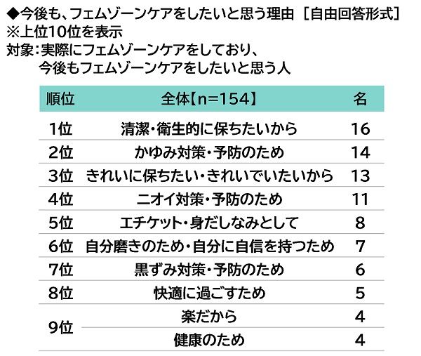 今後もフェムゾーンケアをしたいと思う人(154名)に、その理由を聞いたところ、1位「清潔・衛生的に保ちたいから」(16名)、2位「かゆみ対策・予防のため」(14名)、3位「きれいに保ちたい・きれいでいたいから」(13名)、4位「ニオイ対策・予防のため」(11名)、5位「エチケット・身だしなみとして」(8名)となりました。