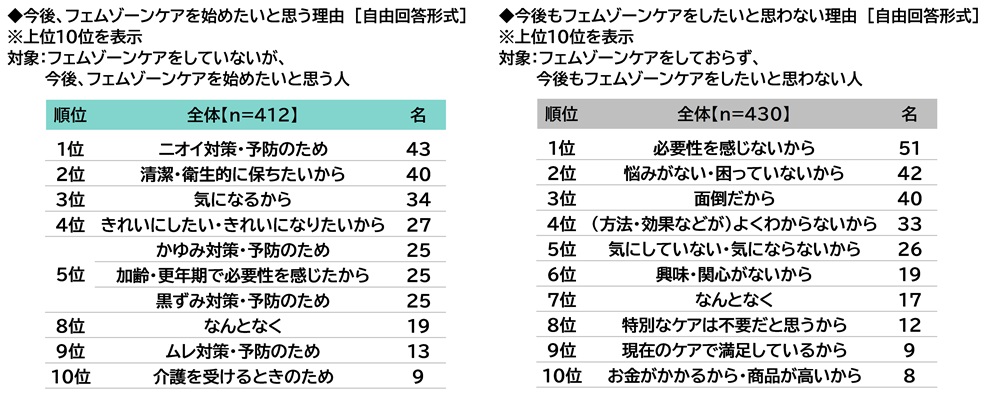 今後もフェムゾーンケアをしたいと思わない人(430名)に、その理由を聞いたところ、1位「必要性を感じないから」(51名)、2位「悩みがない・困っていないから」(42名)、3位「面倒だから」(40名)、4位「(方法・効果などが)よくわからないから」(33名)、5位「気にしていない・気にならないから」(26名)となりました。