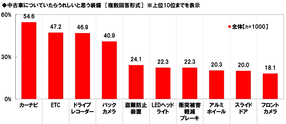 また、中古車についていたらうれしいと思う装備を聞いたところ、「カーナビ」(54.6%)が最も高くなり、「ETC」(47.2%)、「ドライブレコーダー」(46.9%)、「バックカメラ」(40.9%)、「盗難防止装置」(24.1%)が続きました。
