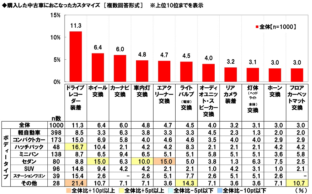 全回答者(1,000名)に、購入した中古車におこなったカスタマイズを聞いたところ、「ドライブレコーダー装着」(11.3%)が最も高くなりました。事故が起きたときやあおり運転などの危険行為に遭った際などに役に立つドライブレコーダーをあらかじめ取りつけておきたい人が多いようです。次いで高くなったのは、「ホイール交換」(6.4%)、「カーナビ交換」(6.0%)、「車内灯交換」(4.8%)、「エアクリーナー交換」(4.7%)でした。