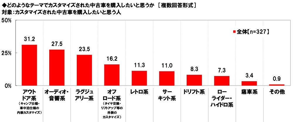 カスタマイズされた中古車を購入したいと思う人(327名)に、どのようなテーマでカスタマイズされた中古車を購入したいと思うか聞いたところ、「アウトドア系(キャンプ仕様・車中泊仕様の内装カスタマイズ)」(31.2%)が最も高くなり、「オーディオ・音響系」(27.5%)、「ラグジュアリー系」(23.5%)、「オフロード系(タイヤ交換・リフトアップ等の外装のカスタマイズ)」(16.2%)、「レトロ系」(11.3%)が続きました。