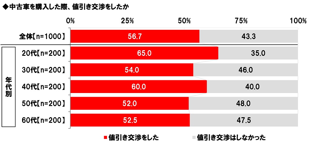 全回答者(1,000名)に、中古車を購入した際、値引き交渉をしたか聞いたところ、「値引き交渉をした」は56.7%、「値引き交渉はしなかった」は43.3%となりました。購入費用を少しでも抑えるため、交渉にチャレンジした人が多いようです。年代別にみると、値引き交渉をした人の割合は20代(65.0%)が最も高くなりました。