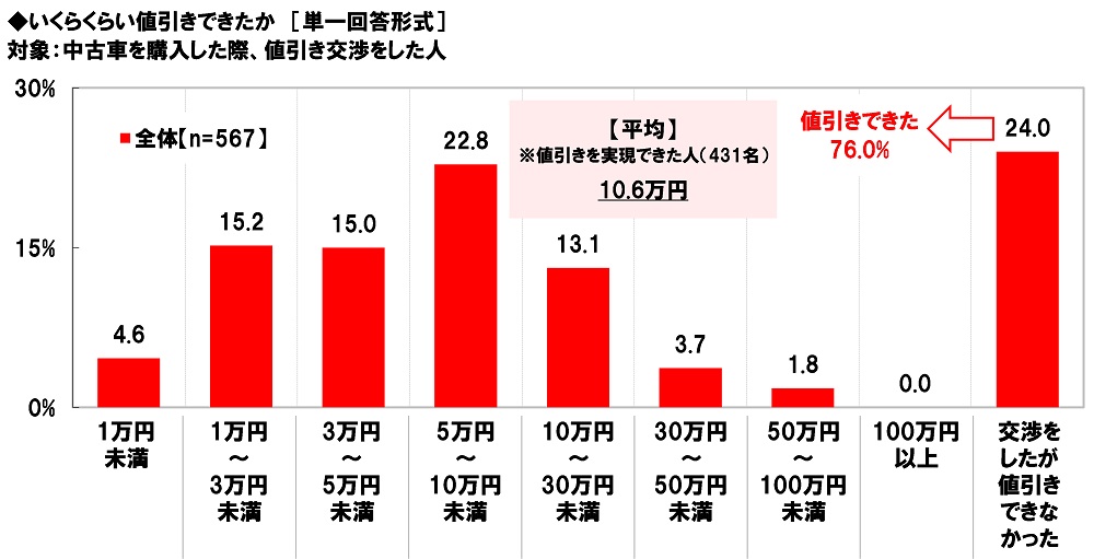 中古車を購入した際、値引き交渉をした人(567名)に、値引きの状況を聞いたところ、「値引きできた」は76.0%、「交渉をしたが値引きできなかった」は24.0%となりました。値引き交渉を試みたものの、希望が全く叶わなかった人は少なくないようです。値引きできた金額は、「5万円~10万円未満」(22.8%)が最も高くなり、値引きを実現できた人(431名)の平均は10.6万円でした。