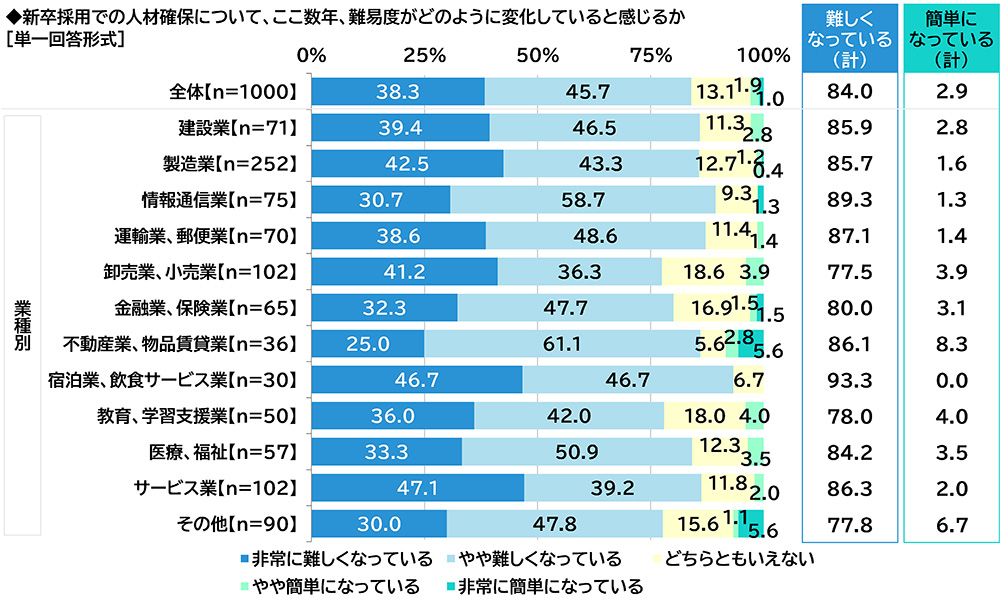 「ここ数年、新卒採用での人材確保が難しくなっていると感じる」新卒採用担当者の84%、[宿泊業、飲食サービス業]では93%