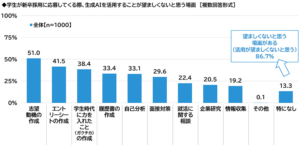 全回答者(1,000名)に、学生が新卒採用に応募してくる際、生成AIを活用することが望ましくないと思う場面を聞いたところ、「志望動機の作成」(51.0%)が最も高くなり、半数を超えた。“なぜその会社を志望するのか”という就職活動の根幹となる部分については、生成AIに作成を任せるのではなく自分の頭で考えたほうがよいと感じている人が多いのではないだろうか。次いで高くなったのは、「エントリーシートの作成」(41.5%)、「学生時代に力を入れたこと(ガクチカ)の作成」(38.4%)、「履歴書の作成」(33.4%)、「自己分析」(33.1%)だった。また、「特になし」は13.3%で、活用が望ましくないと考えている人の割合は86.7%となった。学生が就活の際に生成AIを活用することに対して消極的・否定的にとらえている人が多いようだ。