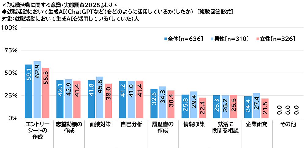 一方、学生が就職活動で生成AIを活用したシーンでも「志望動機の作成」「エントリーシートの作成」がTOP2と、新卒採用担当者と学生でギャップがみられる結果に
