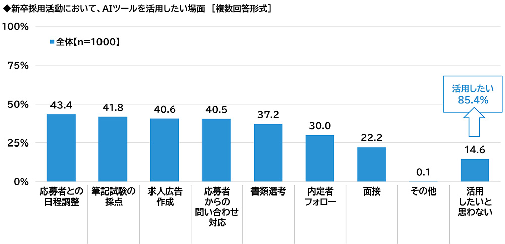 新卒採用活動において、AIツールを活用したい場面を聞いたところ、「応募者との日程調整」(43.4%)が最も高くなり、「筆記試験の採点」(41.8%)、「求人広告作成」(40.6%)、「応募者からの問い合わせ対応」(40.5%)、「書類選考」(37.2%)が続いた。また、「活用したいと思わない」は14.6%で、活用したい人の割合は85.4%だった。新卒採用担当者の大多数が、AIツールを活用することで採用活動を効率化したいと考えているようだ。