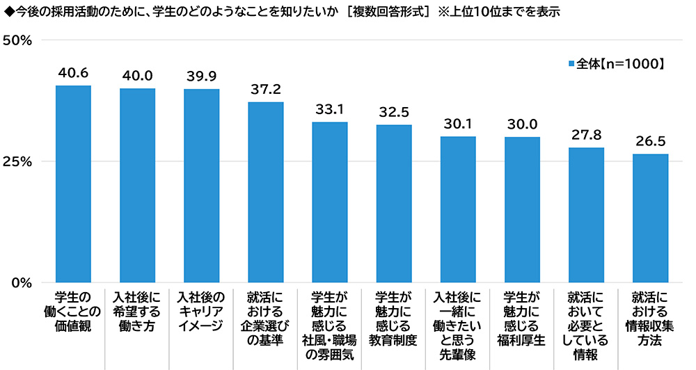 今後の採用活動のために、学生のどのようなことを知りたいか聞いたところ、「学生の働くことの価値観」(40.6%)が最も高くなり、「入社後に希望する働き方」(40.0%)、「入社後のキャリアイメージ」(39.9%)、「就活における企業選びの基準」(37.2%)、「学生が魅力に感じる社風・職場の雰囲気」(33.1%)が続いた。学生の仕事に関する価値観や希望、キャリアイメージなどを把握しておくことで、ミスマッチが少なくなる採用を目指したいと考える人が多いようだ。