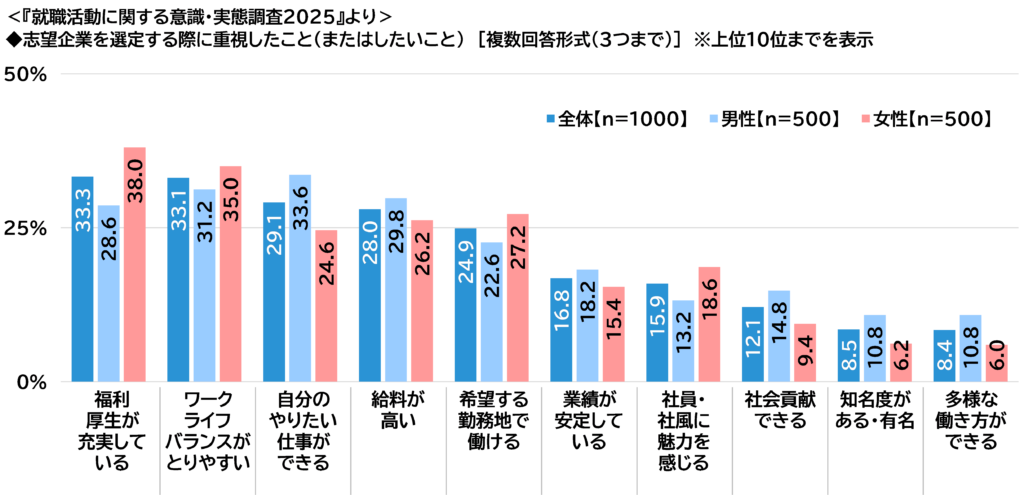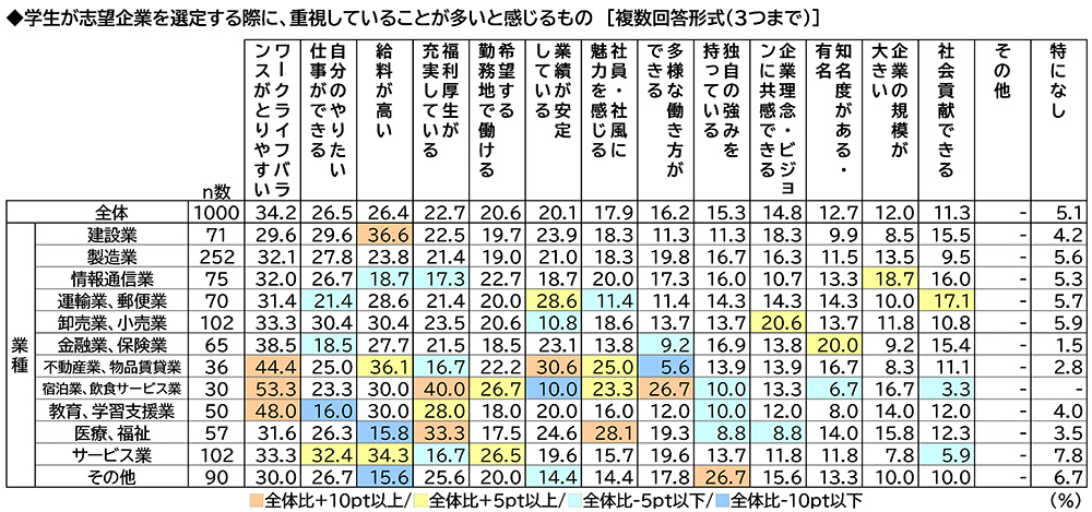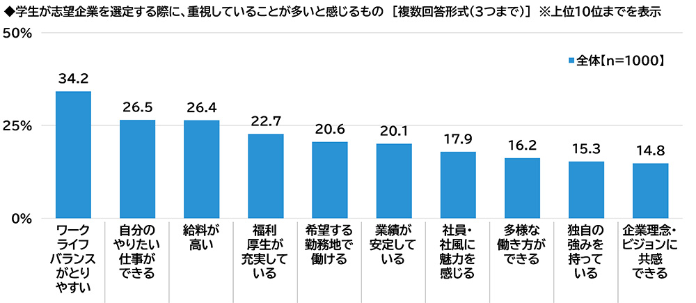 学生が志望企業を選定する際に、重視していることが多いと感じるものを聞いたところ、「ワークライフバランスがとりやすい」(34.2%)が最も高くなり、「自分のやりたい仕事ができる」(26.5%)、「給料が高い」(26.4%)、「福利厚生が充実している」(22.7%)、「希望する勤務地で働ける」(20.6%)が続いた。