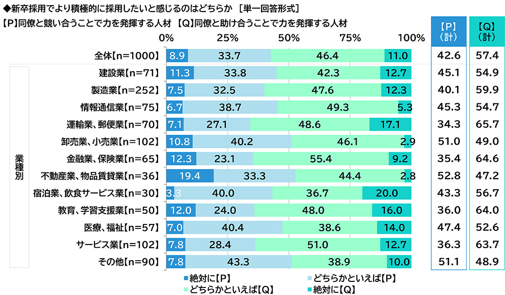 業種別にみると、[卸売業、小売業]と[不動産業、物品賃貸業]では『同僚と競い合うことで力を発揮する人材(計)』(順に51.0%、52.8%)が多数派となった。