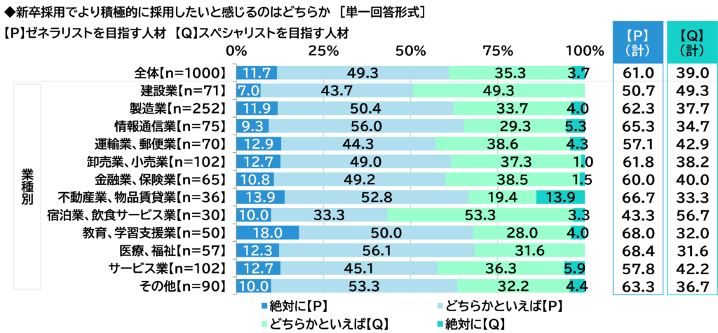 「ゼネラリストを目指す人材」と「スペシャリストを目指す人材」では『ゼネラリストを目指す人材(計)』が61.0%、『スペシャリストを目指す人材(計)』が39.0%となった。