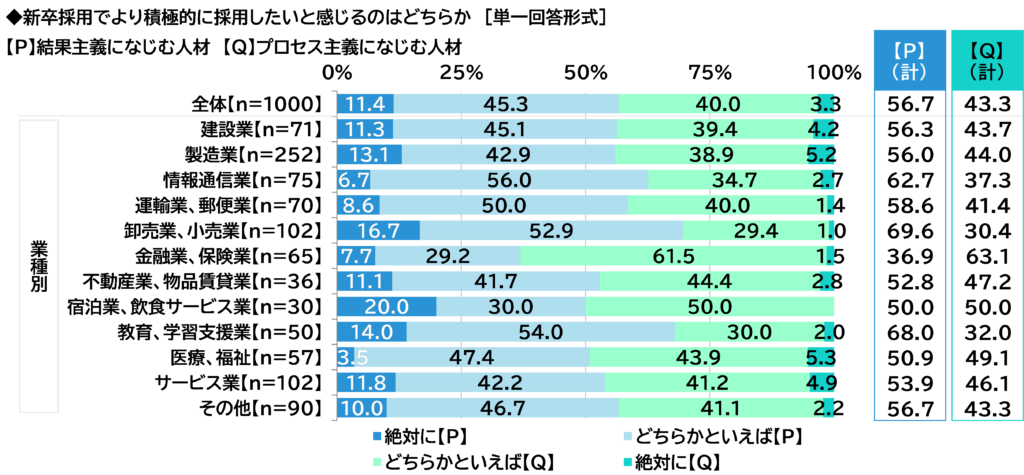 「結果主義(最終的な業績・成果という結果を重視する)になじむ人材」と「プロセス主義(結果に至るプロセスや行動の質、再現性を重視する)になじむ人材」では『結果主義になじむ人材(計)』が56.7%、『プロセス主義になじむ人材(計)』が43.3%となった。