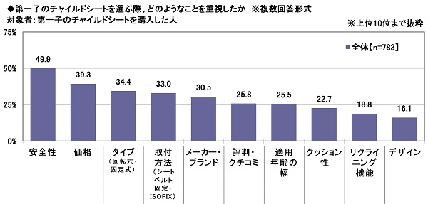 第一子のチャイルドシートを購入した方783名に、第一子のチャイルドシートを選ぶ際、どのようなことを重視したかを聞いたところ、「安全性」(49.9%)が最も高くなり、「価格」(39.3%)、「タイプ(回転式・固定式)」(34.4%)、「取付方法(シートベルト固定・ISOFIX)」(33.0%)、「メーカー・ブランド」(30.5%)が続きました。