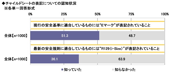 チャイルドシートには、安全基準や安全規則に適合している場合、そのことを示す表記が行われます。全回答者1,000名に、チャイルドシートの表記(※2)についての認知状況を聞いたところ、【現行の安全基準に適合しているものには“Eマーク”が表記されていること】では「知っていた」は51.3%、「知らなかった」は48.7%、【最新の安全規則に適合しているものには“R129(i-Size)”が表記されていること】では「知っていた」は36.1%、「知らなかった」は63.9%となりました。従来から用いられている“Eマーク”については知っていた方が半数を超えている一方、最新の安全基準である“R129(i-Size)”については知っていた方は3人に1人にとどまりました。