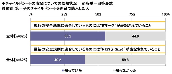 第一子のチャイルドシートを新品で購入した方625名についてみると、【現行の安全基準に適合しているものには“Eマーク”が表記されていること】では「知っていた」は55.2%、【最新の安全規則に適合しているものには“R129(i-Size)”が表記されていること】では「知っていた」は40.2%となりました。